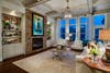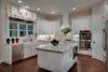 Inside, the model home incorporates an heirloom family feel with modern finishes, rich moldings, grand lighting and elegant fabrics. The sweeping two-story foyer with lantern light fixtures is flanked by a study with rich stained paneling, bold dramatic artwork and gallery lighting. The adjacent dining room with seating for eight is ideal for family gatherings. The family room provides comfortable seating, vibrant artwork, a deep coffered ceiling, floor-to-ceiling Ledgerstone fireplace and a large bank of windows. The gourmet kitchen wows with dazzling luxury features such as white quartz countertops, white linen cabinets, wood vent hood, herringbone backsplash, large island and modern pendant lights. Perhaps one of the most memorable features of this model home is the keeping room featuring a striking painted white brick wall with vaulted ceiling and stained cedar beams. The downstairs guest retreat is a true oasis with soothing greens and blues, linen headboard and shiplap paneled walls; as is the screened porch that overlooks the community green space.