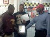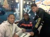 The football players, accompanied by several of their parents, arrived together and caroled their way into the media center carrying six bags of toys. An emotional few minutes ensued, and even these champion football players had to stop to dry their eyes.