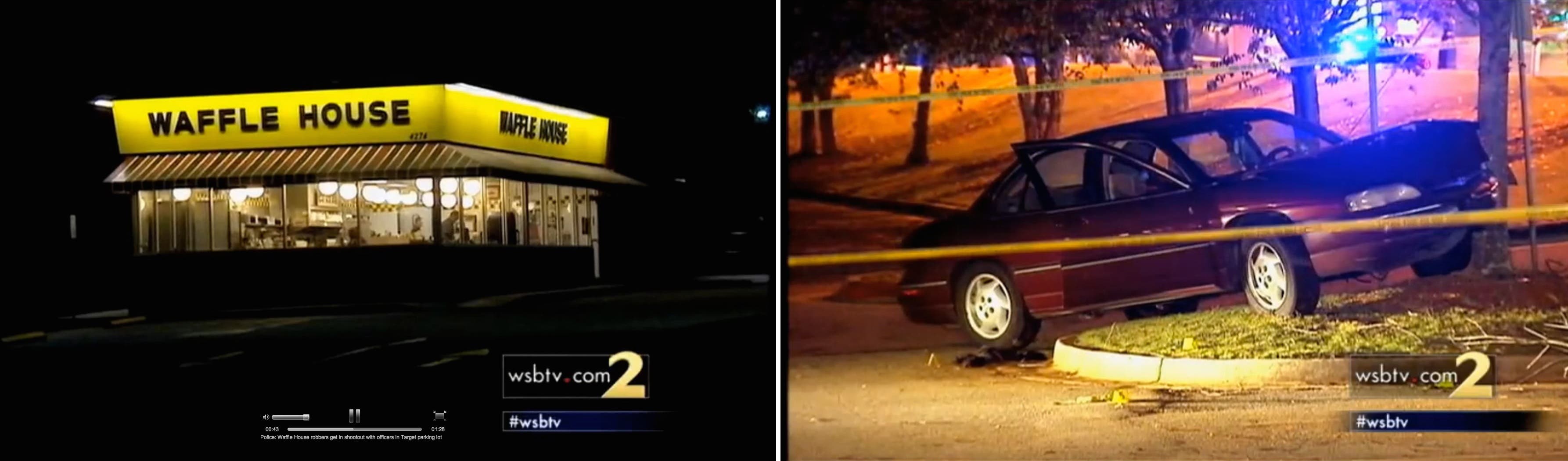 >>Waffle House Restaurant where robbery took place and crashed vehicle. Photo Credit: Screenshot from WSB TV.