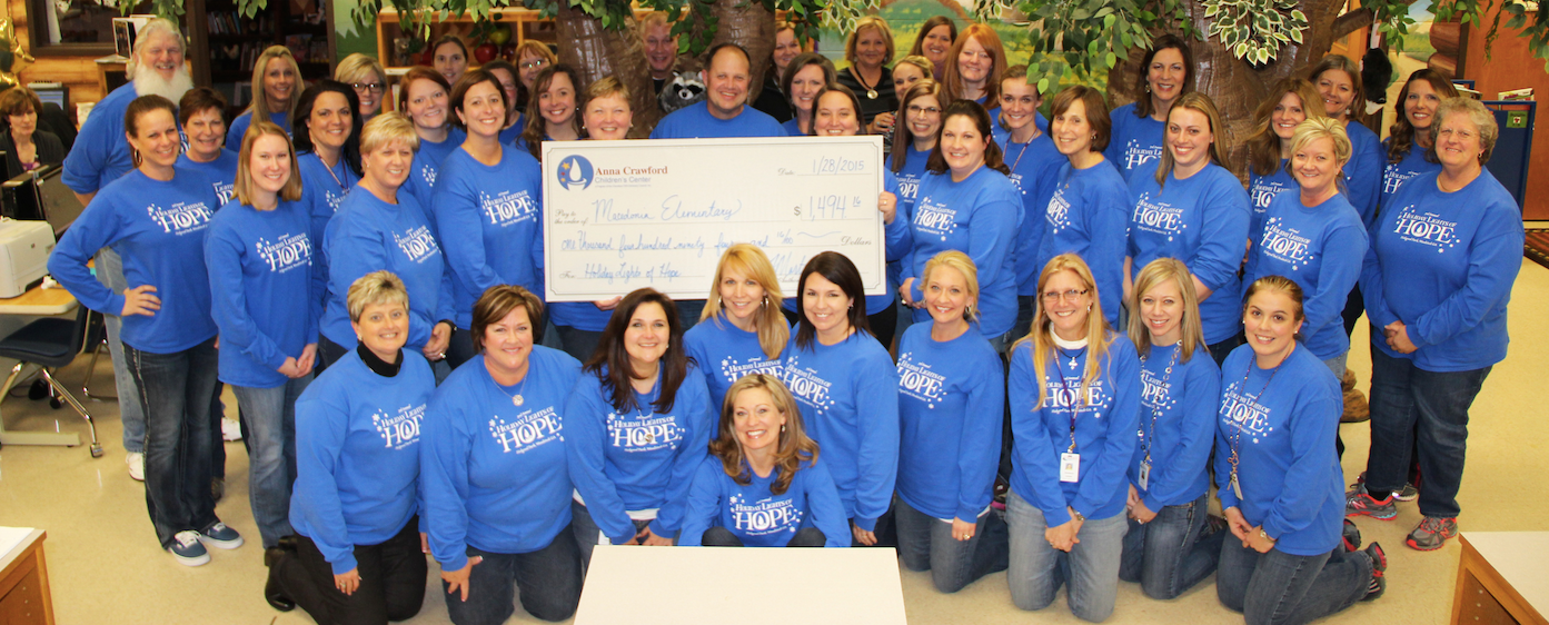 The Anna Crawford Children’s Center is happy to be able to give back a total of $3,783.28 to the participating schools in their efforts to support Holiday Lights of Hope. Macedonia Elementary had the highest percentage of event attendance and received the $1,000 award.