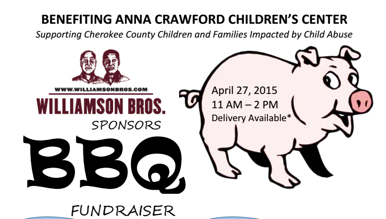A BBQ Lunch, which will benefit the Anna Crawford Children’s Center, will be held 11 a.m. to 2 p.m. Monday, April 27 at the gazebo at Cannon Park in downtown Canton. Cannon Park sits on the square across the street from the Cherokee County Justice Center.