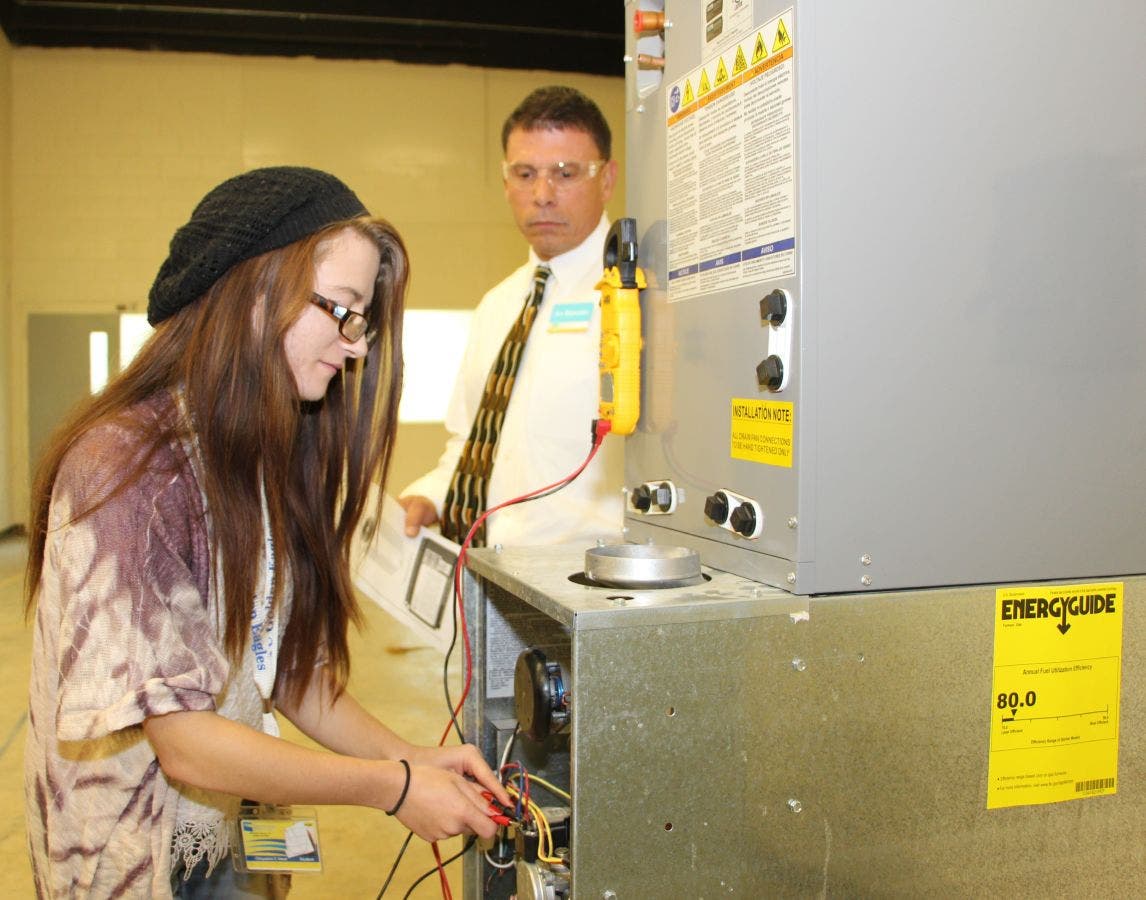 Image via Chattahoochee Technical College: Air Conditioning Technology instructor Joe Esposito looks on as student Cheyanne Head gathers a reading from an AC unit in the AIRC lab.