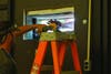 Schools 1: CCSD Facility Technician Lantz Cleveland passes a drill through to technician Terry Cornelison as they re-install air-conditioning units at Free Home ES following a window replacement project in the media center.