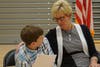 Photo 3: Principal Cindy Cooper gives eighth-grader Bradley Gordon a hug after he spoke during the ceremony.