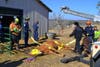 The rescuers were able to slide the horse outside. Once outdoors, a harness was placed around the horse’s body and connected to the boom of a wrecker belonging to Canton-based Mauldin’s Wrecker Service.