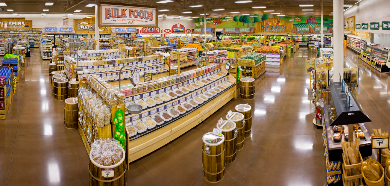 Sprouts Farmers Market bills itself as a healthy grocery store offering fresh, natural and organic foods. Shoppers can expect to find fresh produce, bulk food items, vitamins and supplements, packaged groceries, meat and seafood, baked good, dairy products, frozen food, natural body care products and household items catering to those who believe in sustainable living.