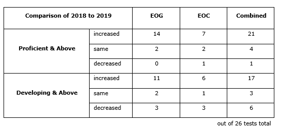 Specifically, the percentage of students achieving the Proficient Learner level and above increased or held steady on 25 of 26 End of Grade (EOG) and End of Course (EOC) assessments, compared to 22 of 26 assessments in 2018. The only assessment for which the percentage of students achieving the Proficient Learner designation was lower saw a one-point drop compared to 2018. Students who achieve the Proficient Learner designation are considered on track to being college- and career-ready.