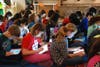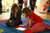 Photo 7: Students Mya Jackson and Ivy Jenkins work on iPads while enjoying bean bags chairs. Furnishings for the lab were donated by BrainPOP and E-line Media.