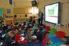 Photo 2: Technology teacher Kristen Brooks goes over the basics of an application called “ScratchJr” with her class of fourth graders. The free app is a basic programming language that enables users to create their own interactive stories and games. Ms. Brooks gets the students started on the app, then they dispersed to different parts of the room to work alone or in groups on their new iPads.