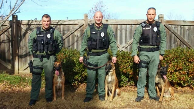 Photo: from left, Sgt. Shane Collie with K9 Mann, officer Jake Cash with K9 Debo and officer Jarred Jackson with K9 Dugan. Credit: Woodstock Police Department