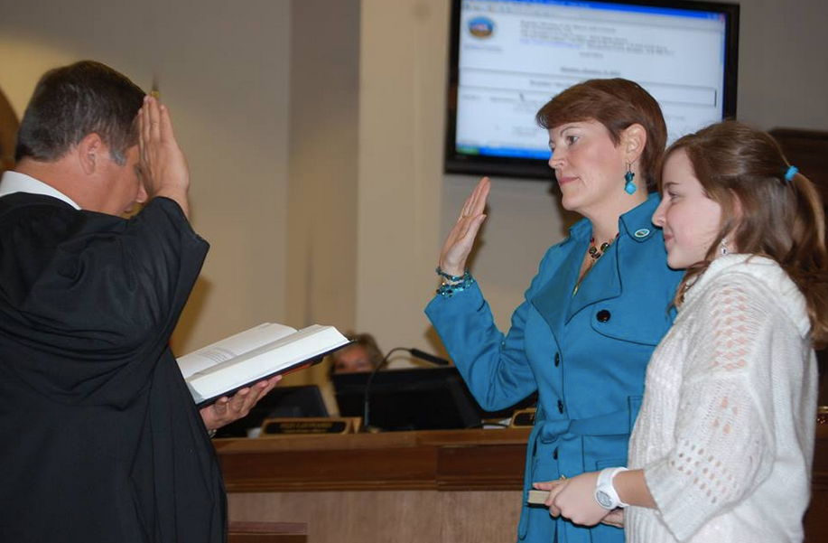 Photo: Tessa Basford, center, during her September 2011 swearing in ceremony with daughter Katie, right, and Cherokee County State Court Judge A. Dee Morris. Credit: city of Woodstock/Facebook
