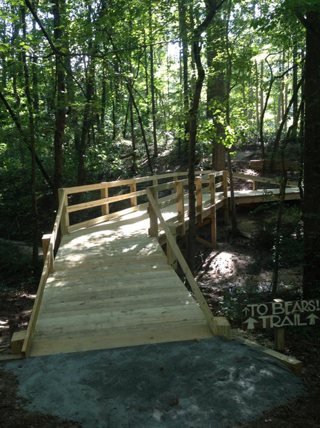 (Photo: bridge and boardwalk at the Dupree Park Family Mountain Bike Trail, which bridge connects the Bear Trail to the Lion and Tiger trails. Credit: city of Woodstock)