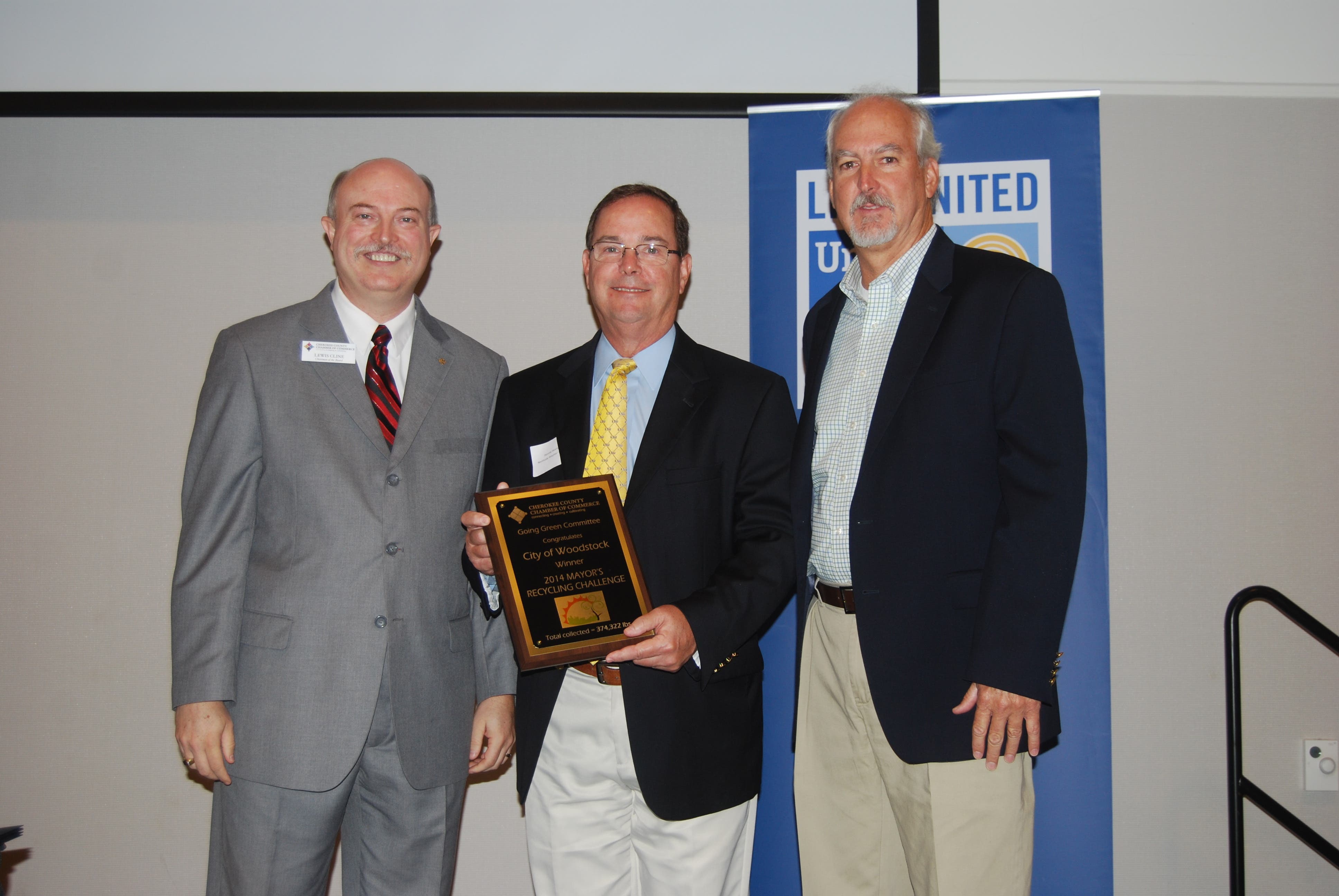 (Photo: From left to right: Lewis Cline, chair of the Cherokee Chamber of Commerce Board of Directors, Woodstock Mayor Donnie Henriques and Going Green Chairman Vic Knight of Waste Management. Credit: Cherokee County Chamber of Commerce)