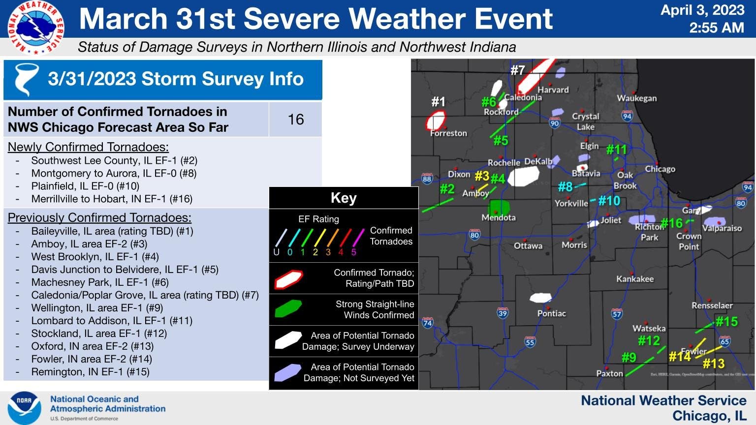 Fourteen other tornadoes were confirmed around Illinois. The weather service said it is still surveying damage, and there is additional investigation ongoing.
