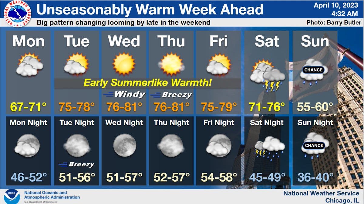 ILLINOIS — Unseasonable warmth is expected all week, as temperatures will reach 80 degrees in the Chicago area, according to the National Weather Service.