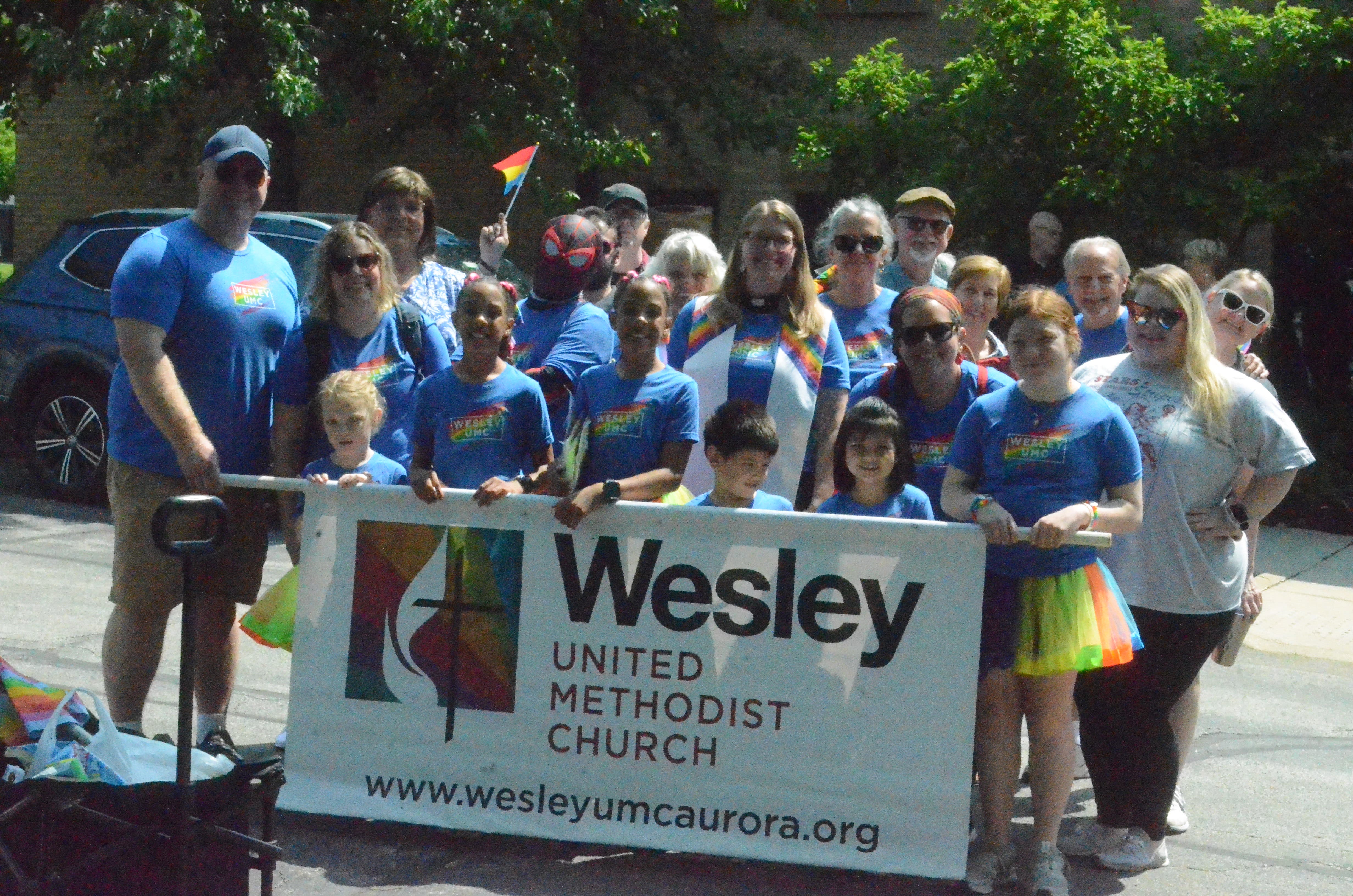 Al Benson photographed this group of Pride Sunday worship attendees from Wesley United Methodist Church at downtown Aurora's Pride parade.
