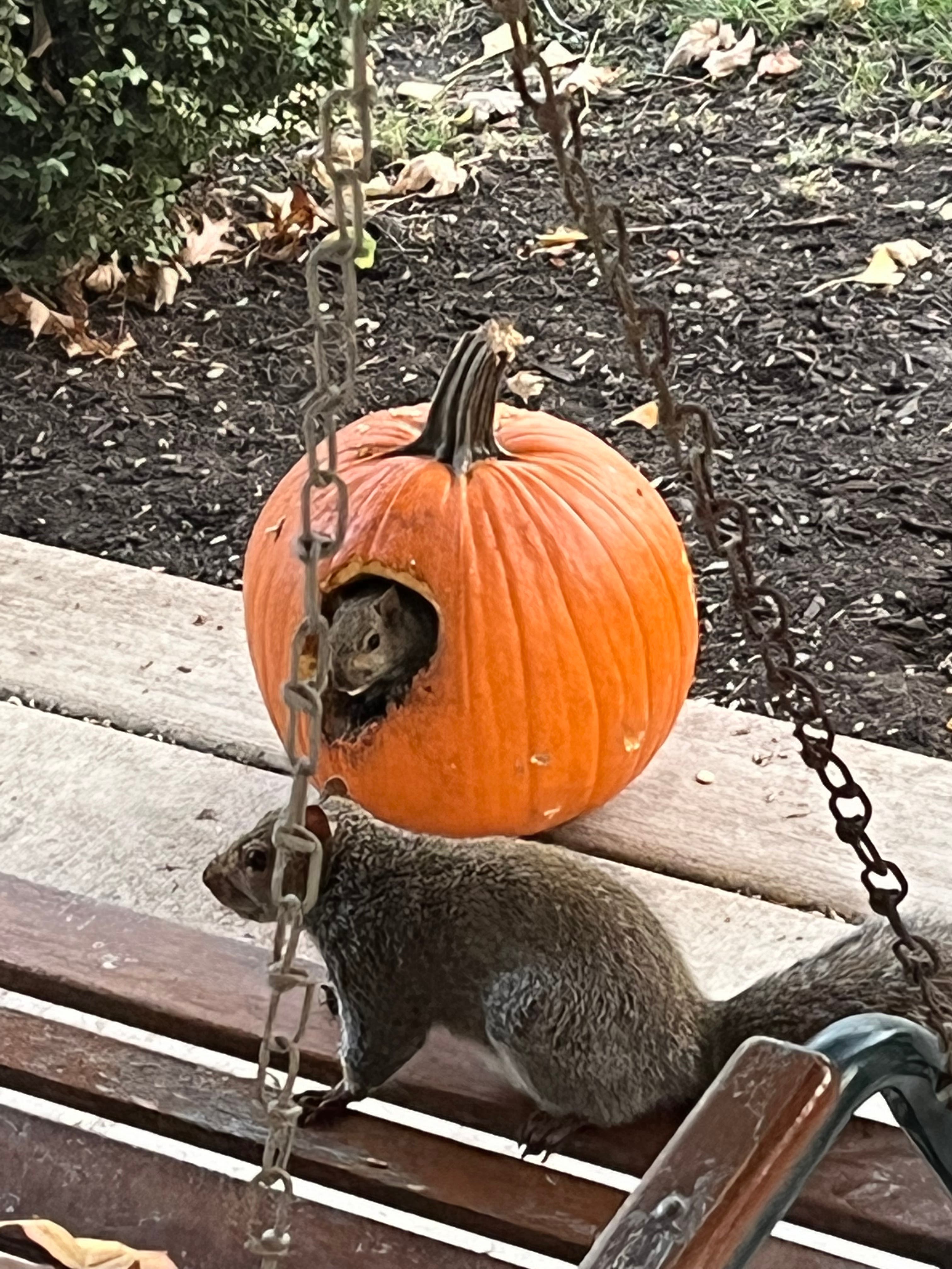 Mary Pirc, of Plainfield, proves that local squirrels are still enjoying pumpkins in this photograph taken from her front porch.
