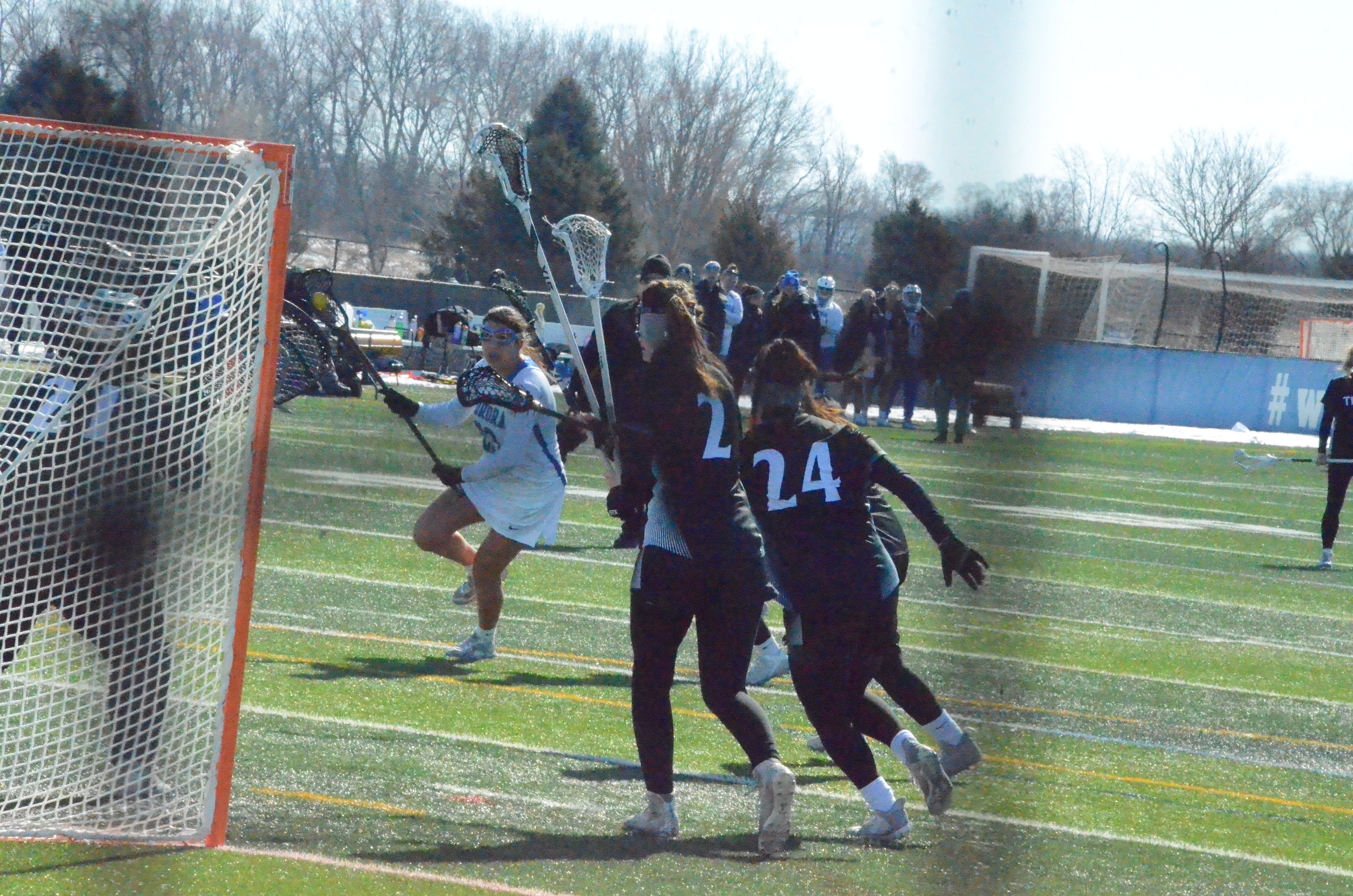 Al Benson submitted this sports photo he took of Aurora University women's lacrosse midfielder Brianna Peck, center, who scored three goals last Saturday as the AU Spartans beat visiting Illinois Wesleyan, 10-7, at Spartan Athletic Park in Montgomery in the season opener for both teams.