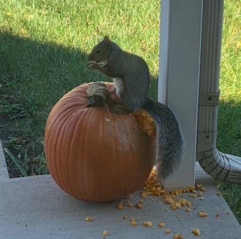 Samantha Tilley, of Joliet, caught this squirrel "having fun eating my pumpkin on the porch."