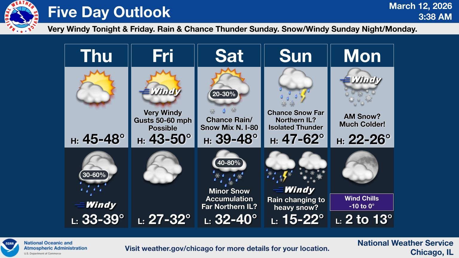 A high wind warning has been issued for most of the Chicago area, starting early Friday as gusts up to 60 mph are possible, the National Weather Service shared.