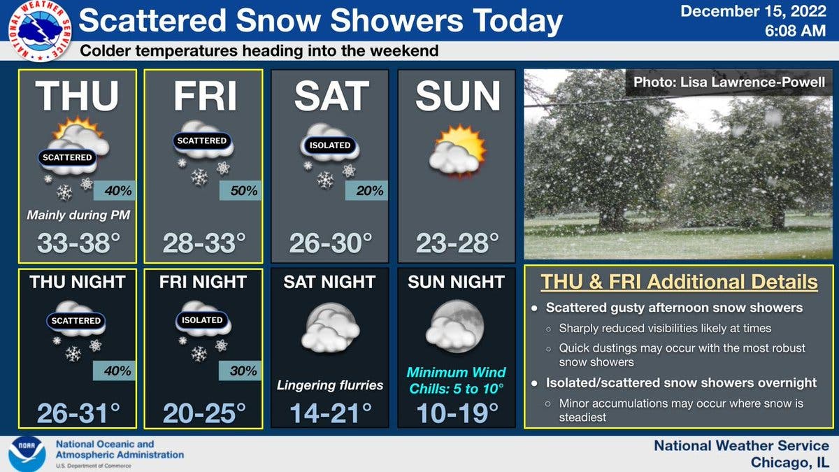 According to the National Weather Service, scattered gusty snow showers are expected Thursday afternoon. Similar weather is expected Friday, the weather service said.