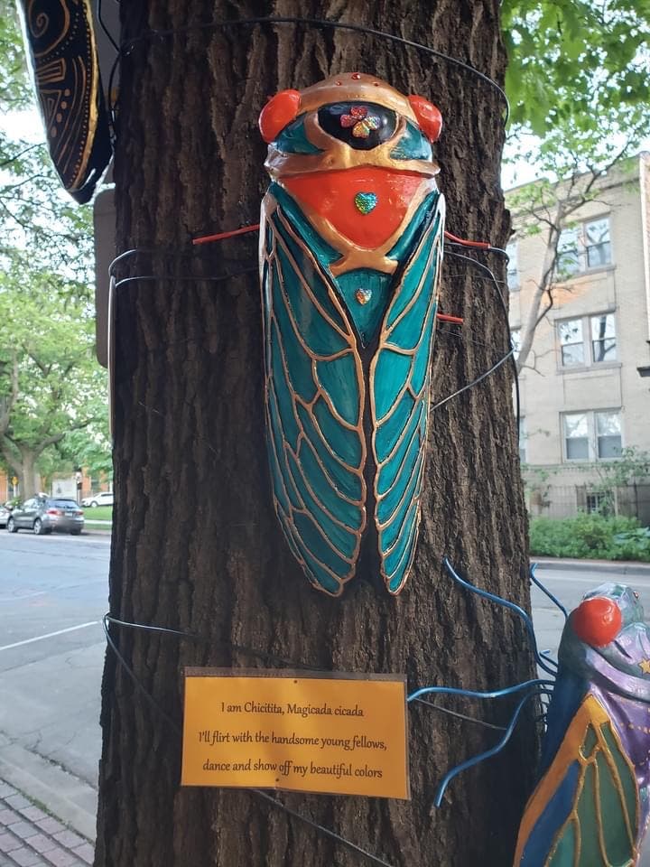 Ann Viernes, of Oak Park, took a photo of cicadas she painted and displayed for the Cicada-parade-a. They are located on the oak tree outside her art gallery, Purple Sun Arts, in the Oak Park Arts District.