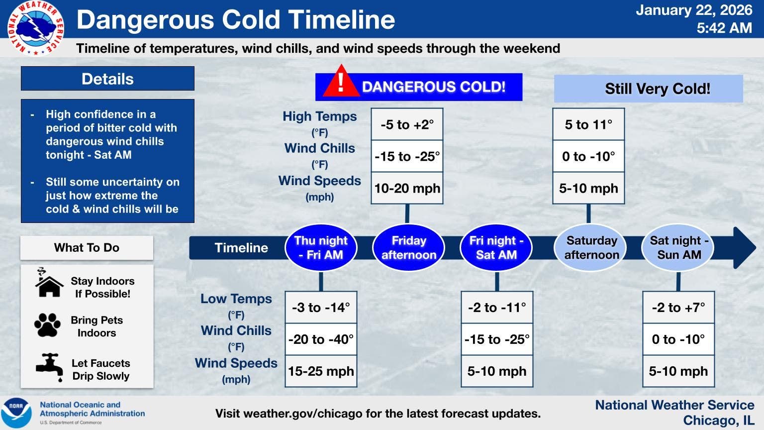 Dangerously cold wind chills as low as 40 below zero are expected for the Chicago area on Friday, according to the National Weather Service. An extreme cold warning has been issued from 3 a.m. to noon on Friday for the area.