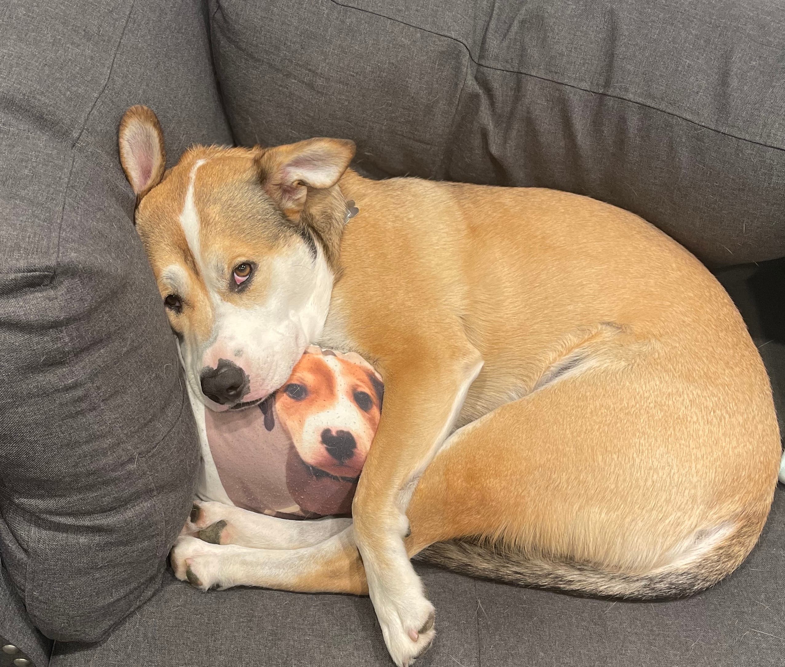 Anthony Vasile, of North Beverly, sent in this photo he took of his dog, Martin, 4, curled up on a small pillow with a picture of him as a puppy. Martin is a Stafford terrier husky mix.