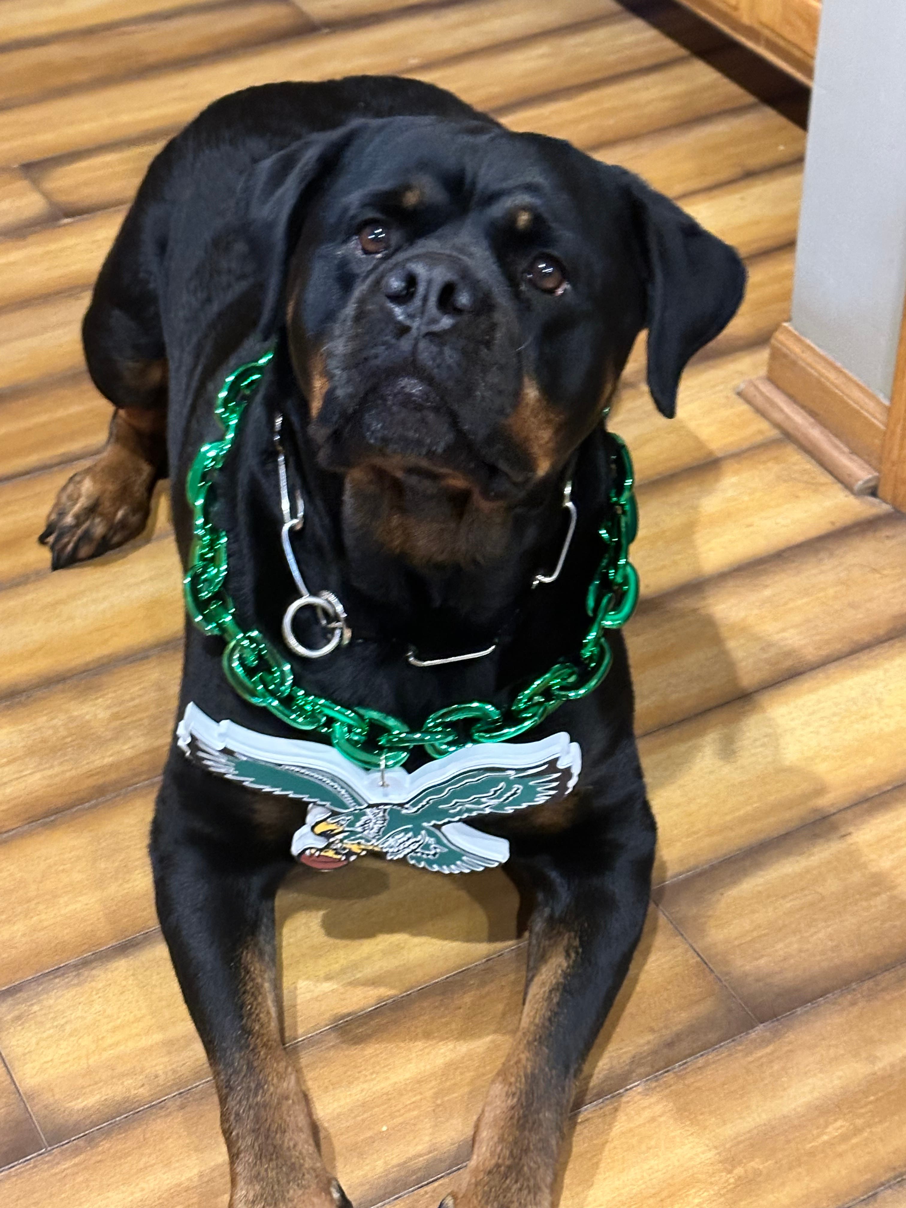 Dianna Cerulli-Massat, of Peotone, says her dog, Freedom, is a huge Philadelphia Eagles fan. She's seen here wearing her Eagles chain on gameday.