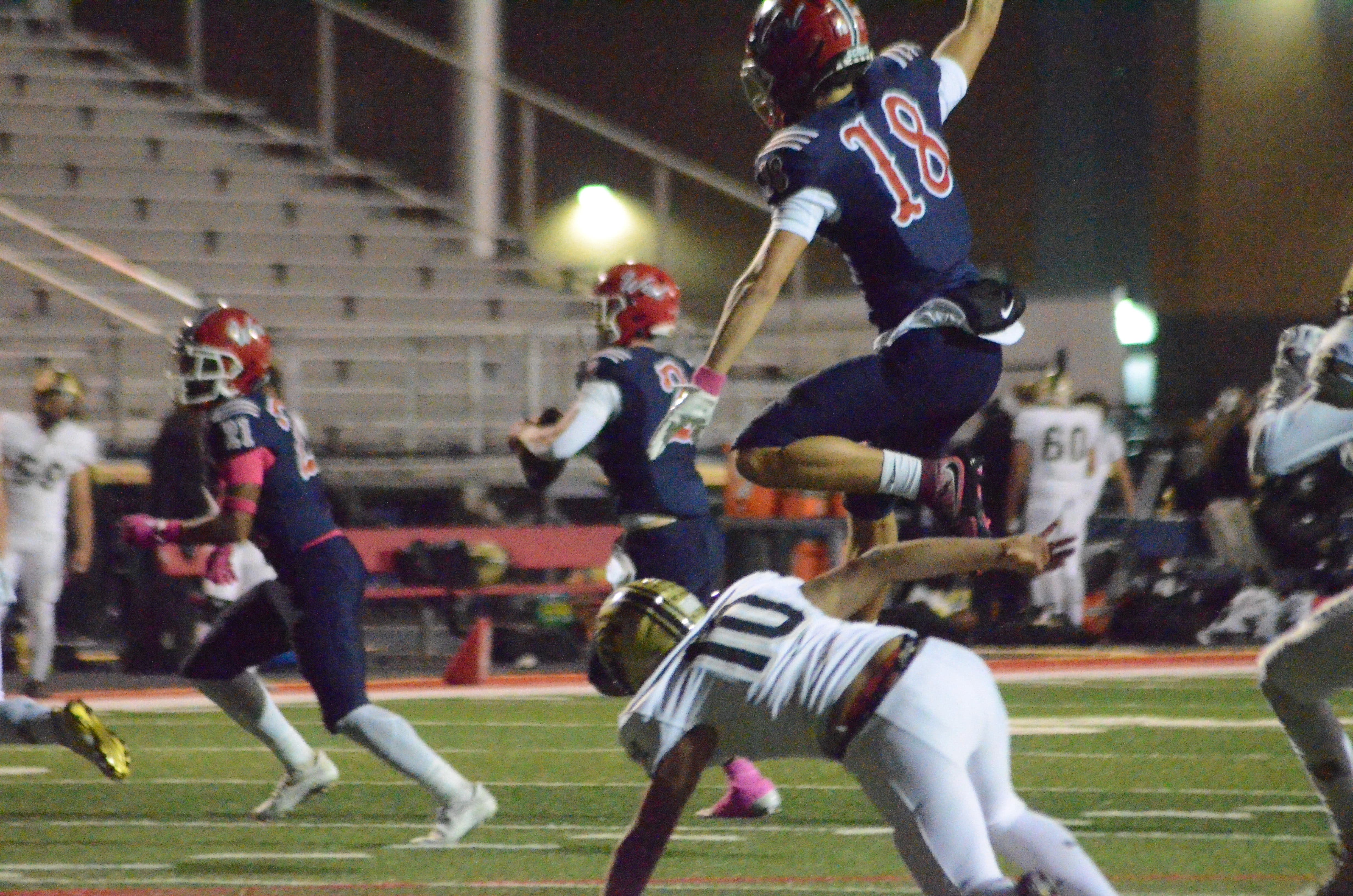 Al Benson sent in this sports photo he took of West Aurora's Jaylen Love (18) leaping over Streamwood's Armando Ruiz (10) during the Blackhawks' 56-0 win in Friday night football, Oct. 25 at Aurora.