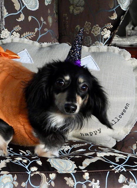 Linda Xydas, of Palatine, dressed up her dog, Lilly, to wish everyone has a "safe and fun Halloween weekend."