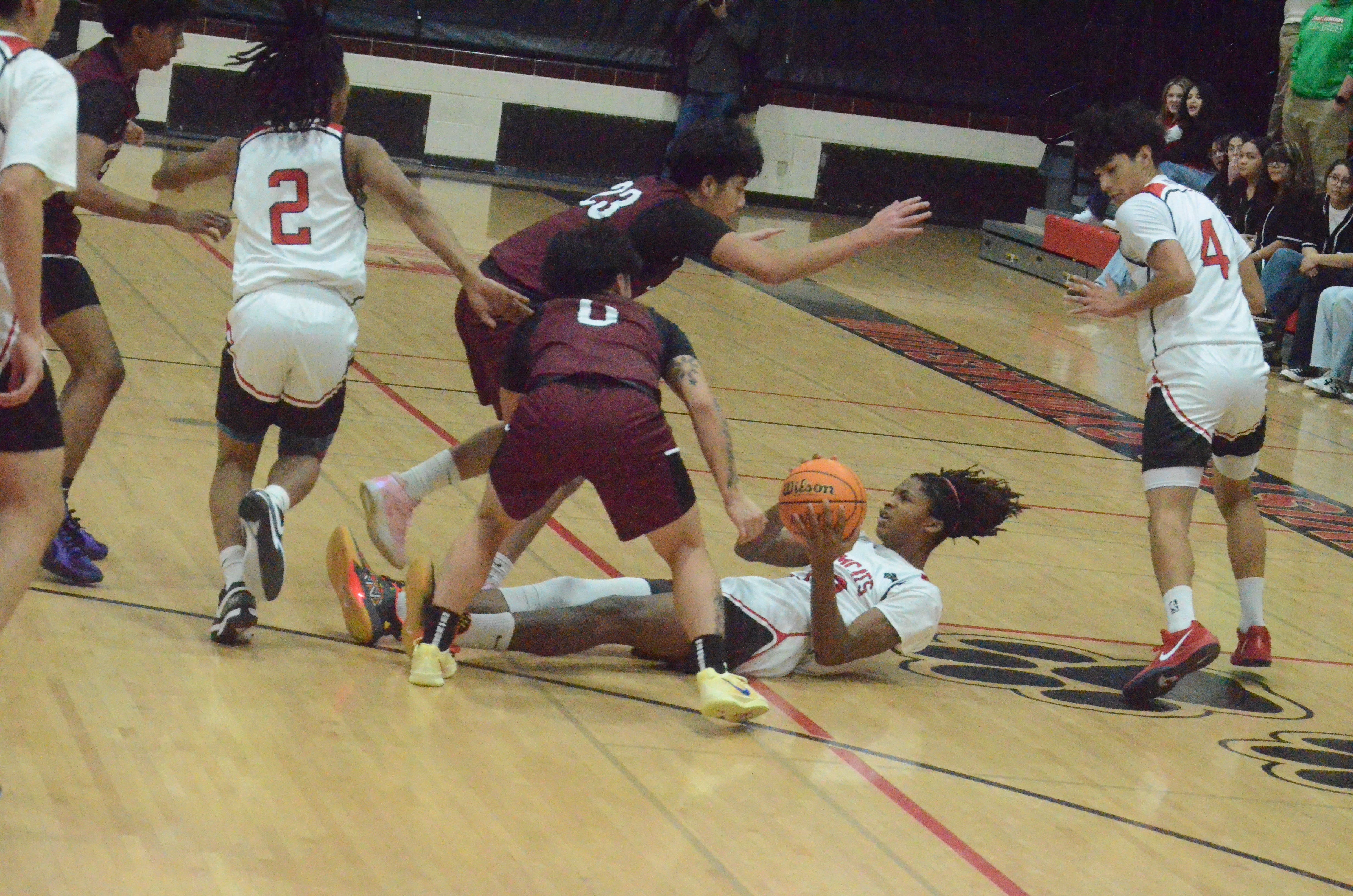 Al Benson captured the basketball action as East Aurora's Jaiyon Spivey looks to pass around Elgin's Timothy Singson (0) and Nic Avina (23) at Aurora Friday, Jan. 24. East won 61-19.