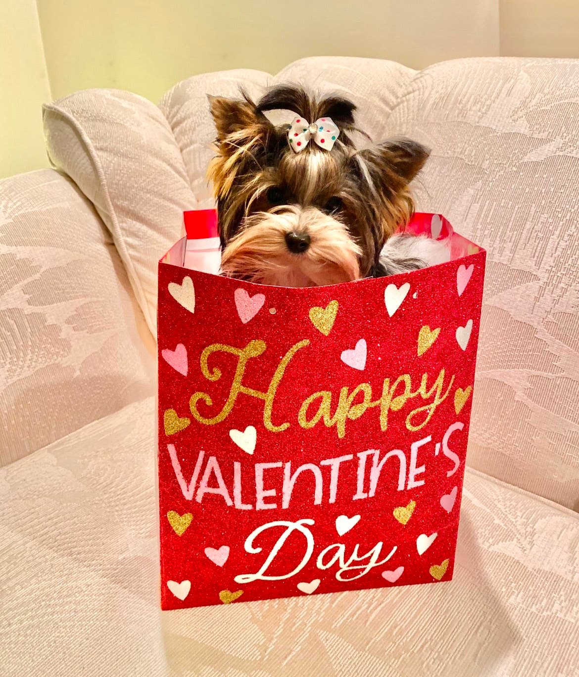 Connie Shifflet, of New Lenox, tells us her Biewer terrier, Tikki, only weighs three pounds and fit nicely into this Valentine's Day bag.