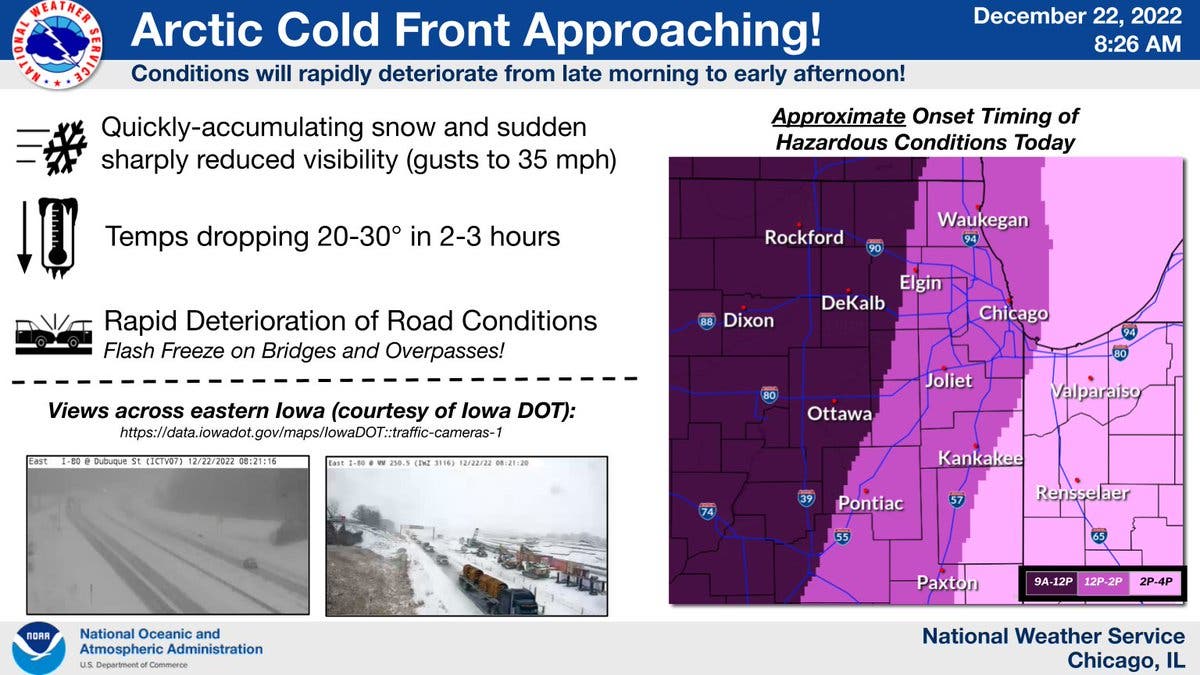 ILLINOIS — An arctic cold front, as well as possible blizzard conditions and high wind, is bearing down on the Chicago area, according to the National Weather Service. As of 8:30 a.m. Thursday, the weather service said the arctic front had crossed the Mississippi River and was approaching Interstate 39.