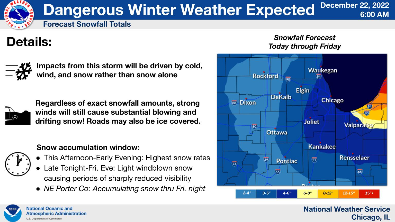 The entire Chicago area is under a winter storm warning, which ends at 6 a.m. Saturday. Snow and blowing snow could produce intermittent white-out conditions, according to the weather service.