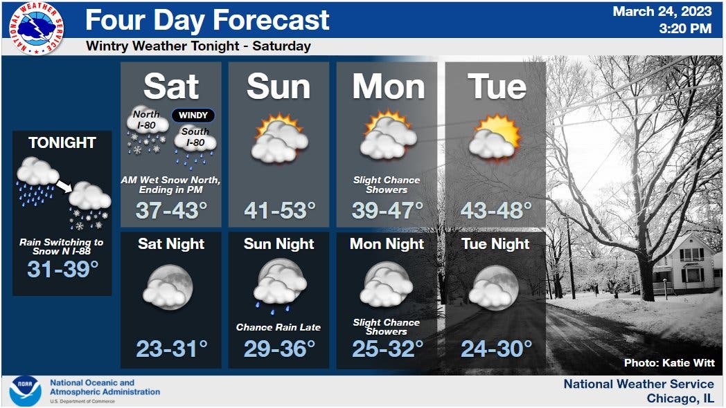 Cook County could see 2 to 4 inches of wet, accumulating snow on Saturday between 7 a.m. to 1 p.m. Slushy, wet roads are possible, along with snowfall rates in excess of 1 inch per hour.