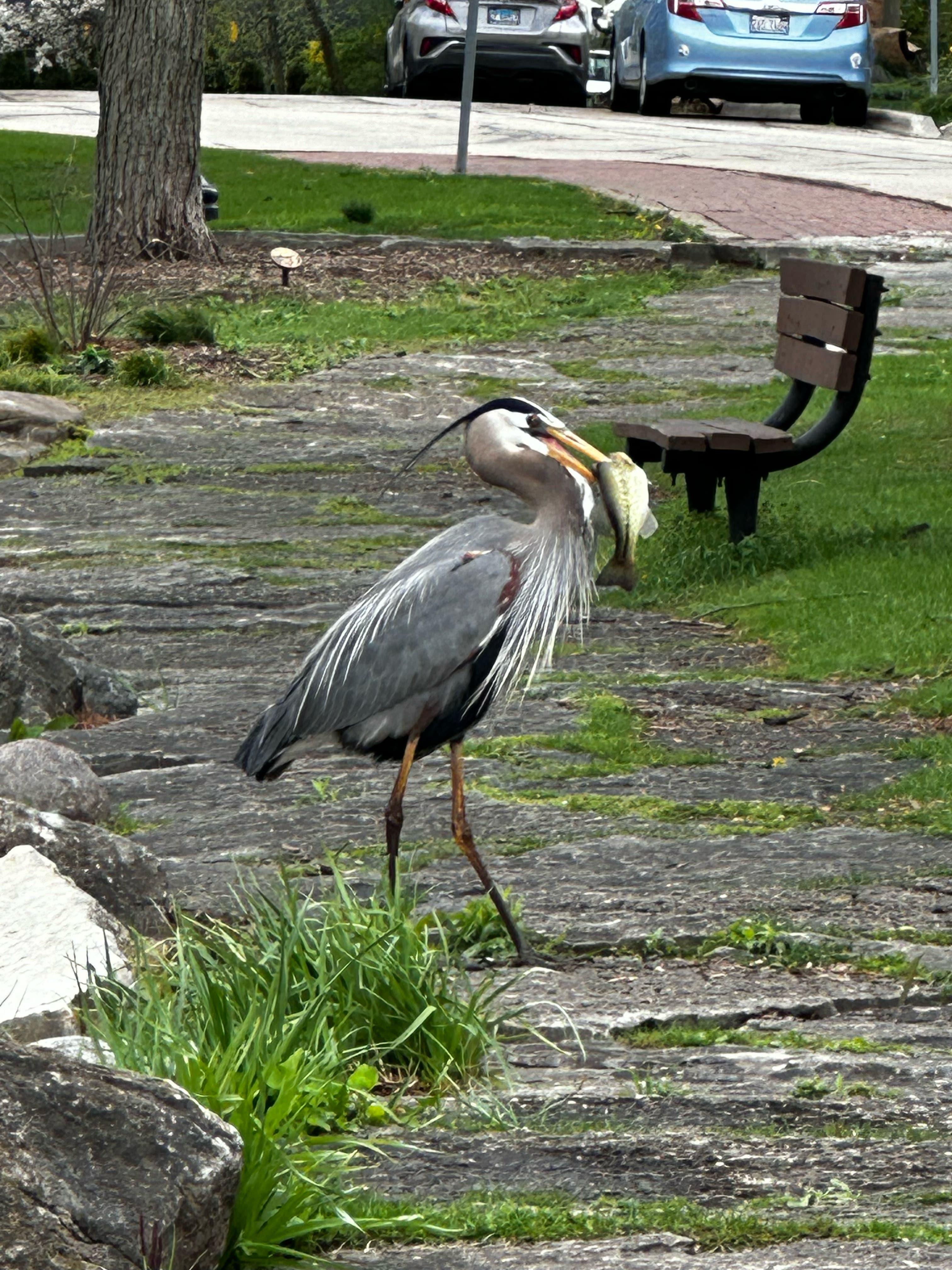 Frank Gilliam sent us this photograph he took of a blue heron with a fish they caught at Prince Pond in Downers Grove.