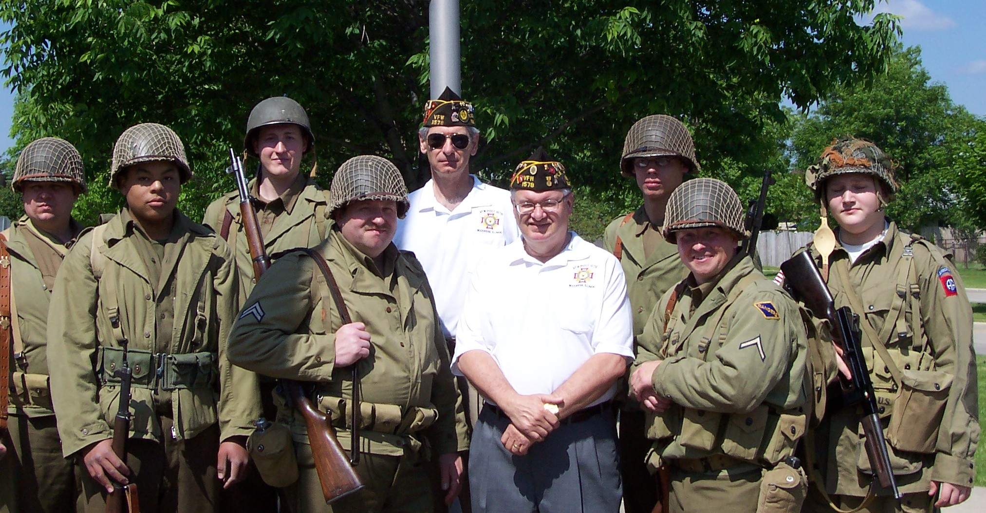 "This picture is from our VFW Memorial Day service in 2005. It pictures VFW members John Sucansky and Ray Travis surrounded by a platoon of World War II re-enactors. This is to honor all of Woodridge's World War II veterans."