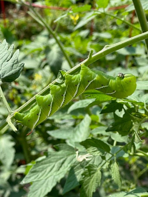 Pauline N, of Lemont, said she found this Carolina sphinx caterpillar munching away on some tomato leaves in her garden and got out the camera. "I must say it scared me at first sight! The kids next door are thrilled to have a new pet," Pauline told us.