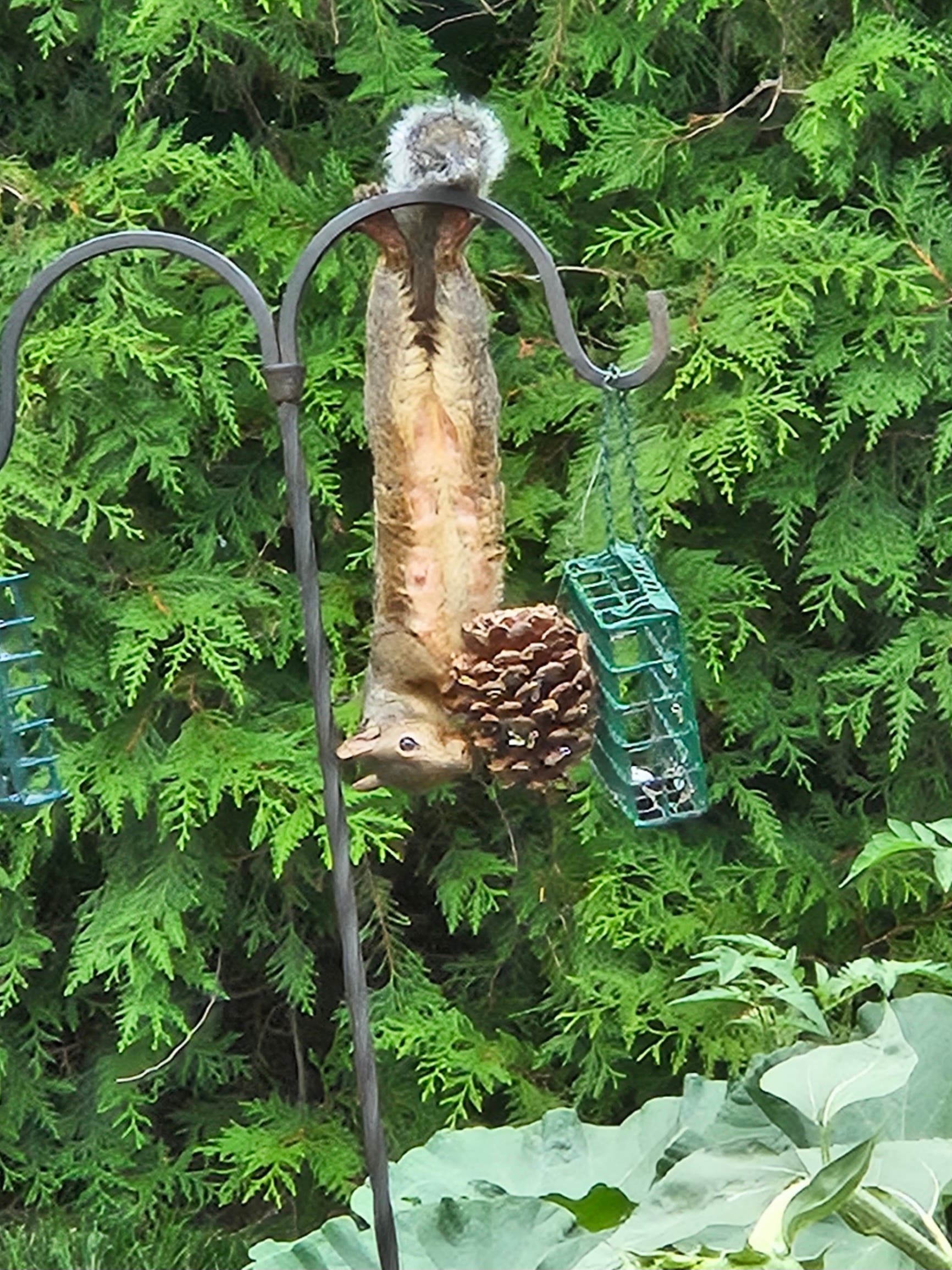 Juliet Dunmeyer, of Cary, photographed this upside-down squirrel in her backyard. "Since the weather was so hot, I decided to grab a pine cone and put peanut butter on it and roll it in bird seed. Within one hour he appeared and ate it up," Dunmeyer said