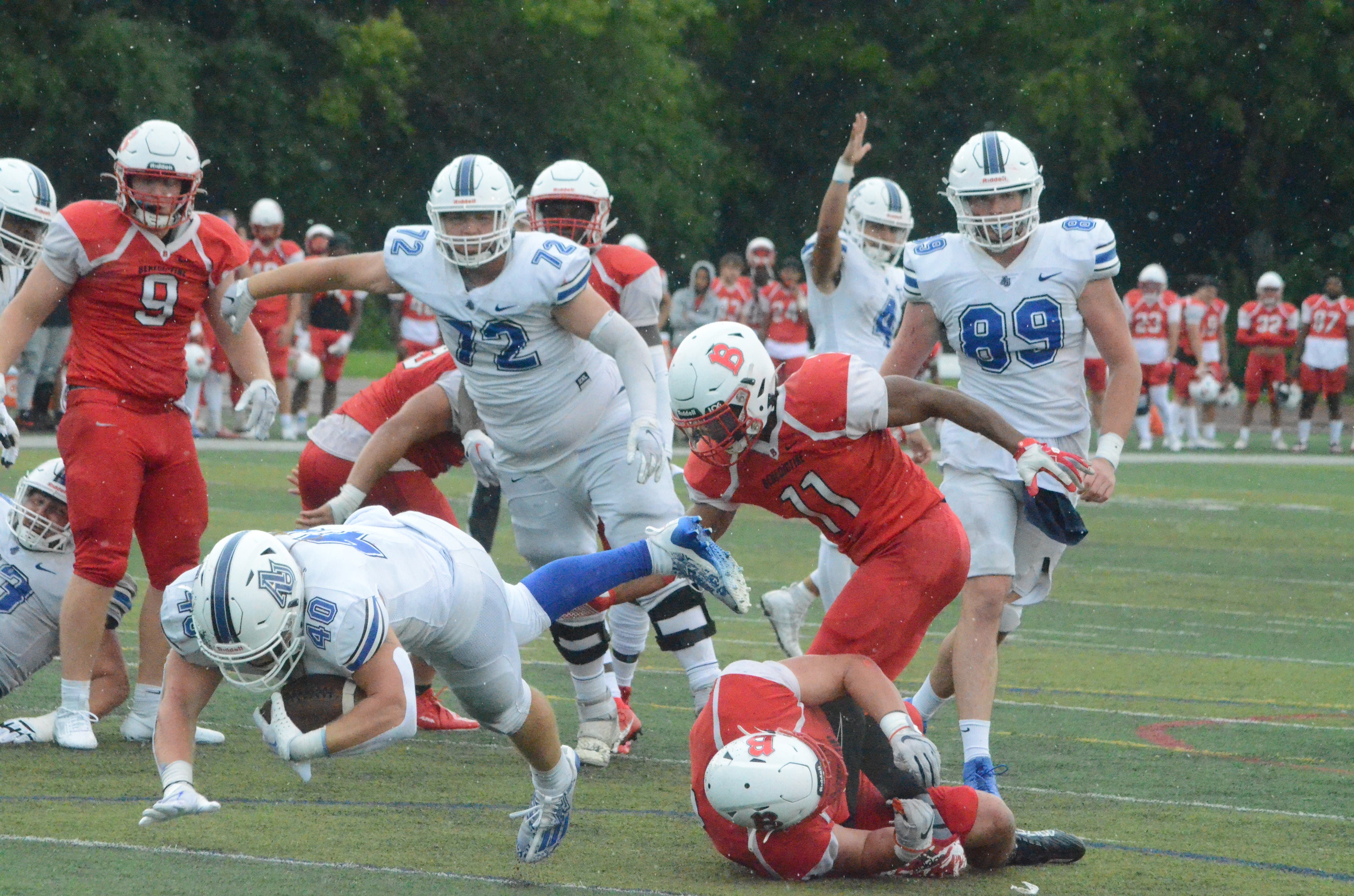 Al Benson photographed Aurora University running back Jon Alstott (40) diving for a touchdown against Benedictine University at Lisle. Aurora won 63-7.