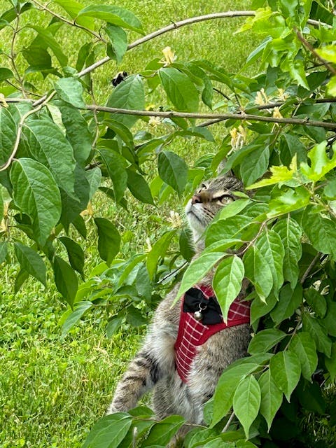 Nikki Eken, of Bolingbrook, sent in this photo she took of her cat, Ralphie, checking out a bumblebee in the neighbor's bushes.
