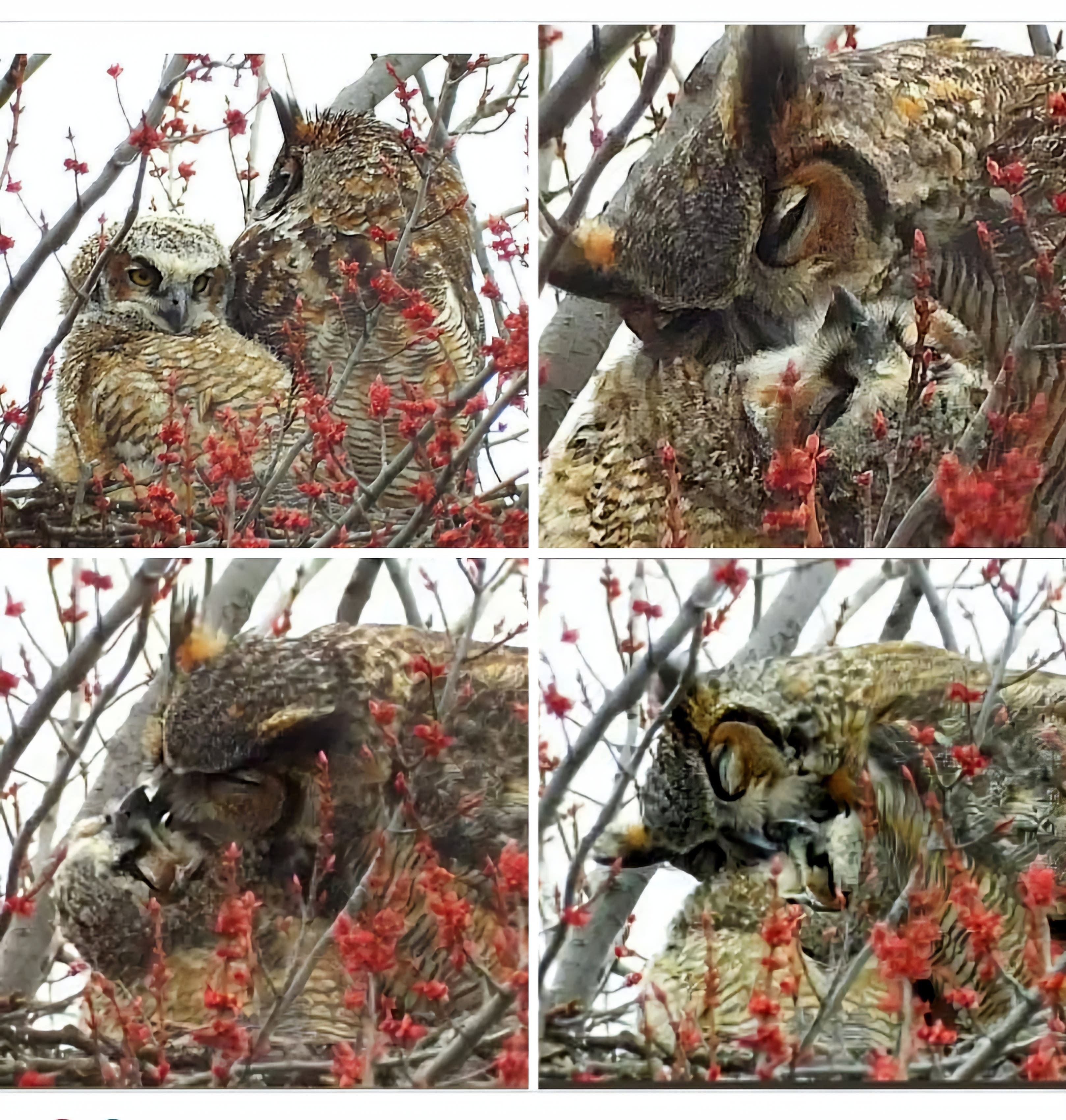 Deb Garcia made this collage of photos she took of a Great Horned Owl Mother snuggling and cleaning her baby