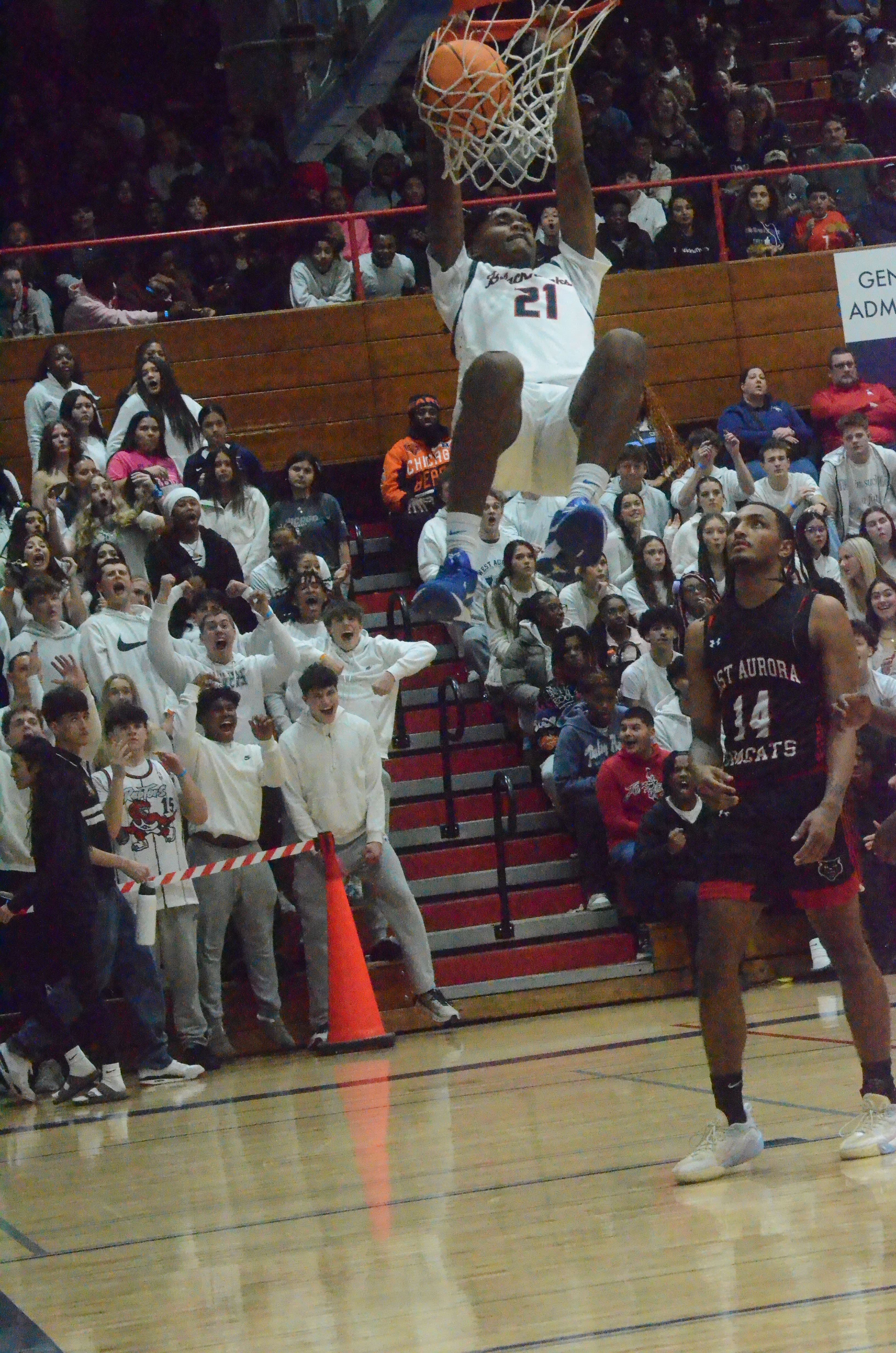 Al Benson also sent in this one he took of West Aurora's Amon Greene (21) dunking over East Aurora's Jason Moore (14). West Aurora, the home team, won, 80-52.