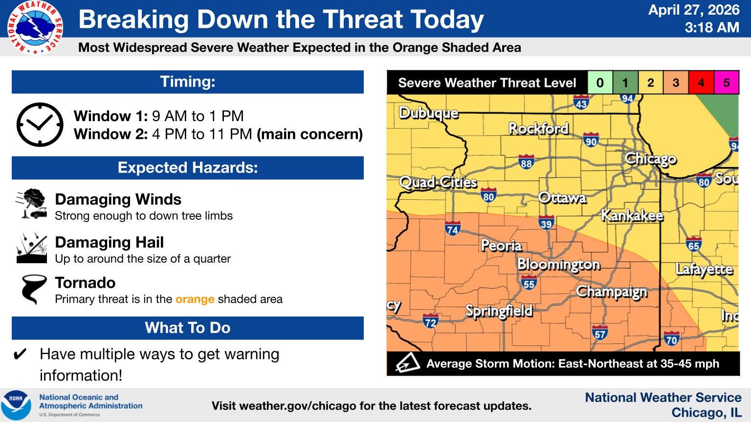 Areas closer to Chicago could still see damaging winds or severe storms, but the primary tornado threat is for central and southern Illinois as some forecasters warn of a possible tornado outbreak.