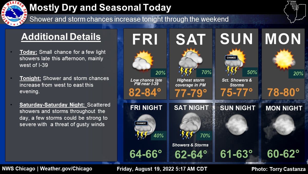 Rain could begin Friday night, with a small chance of light showers late Friday afternoon, mainly west of Interstate 39. Shower and storm chances will then increase from west to east on Friday evening, the weather service said.