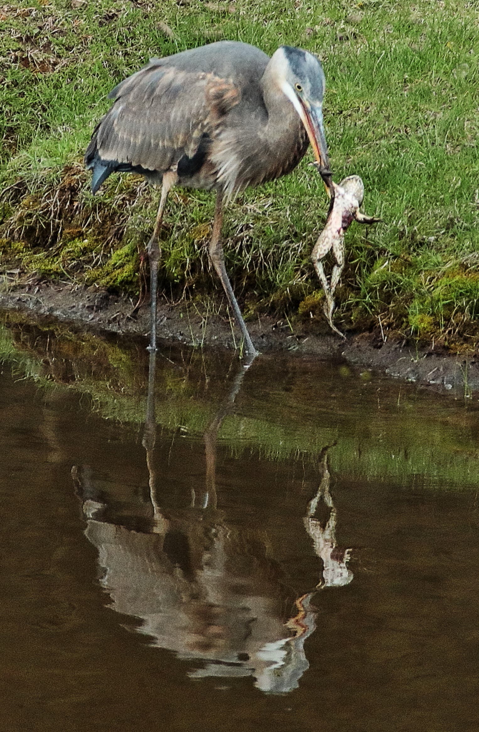 Dick Davis, of Oswego, unlike the frog, was in the right place at the right time to get this photograph of a blue heron in his backyard.