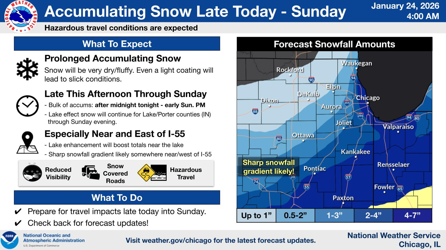 A sharp snowfall gradient is likely, with parts of the Chicago area getting anywhere from half an inch to three inches depending on location, with higher snow totals further east and into northwest Indiana of two to four inches for some areas and as much as 4 to 7 inches for others.