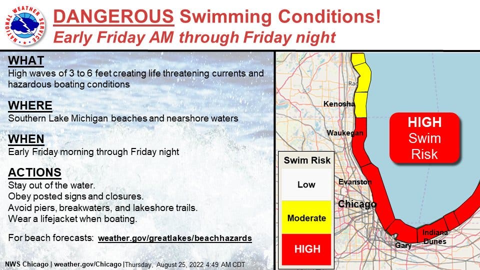 Breezy northeast winds will also create dangerous swimming conditions at Illinois beaches all day on Friday. 3 to 6 foot high waves are possible, the weather service said.