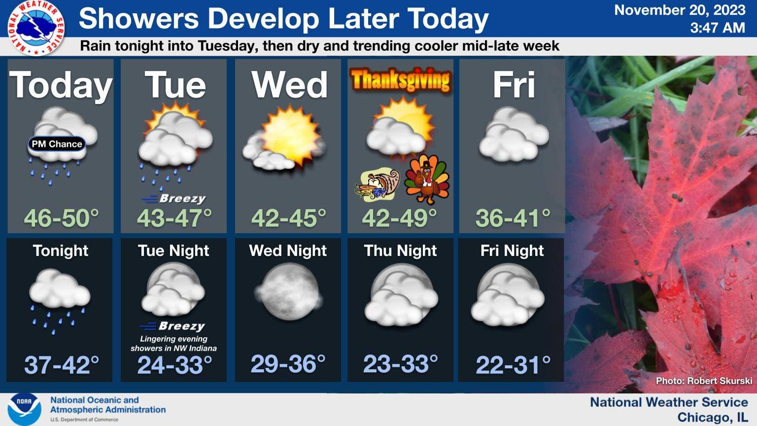 ILLINOIS — If you're traveling later this week for Thanksgiving, the weather forecast looks like it'll be in your favor. While the week will start off rainy on Monday and Tuesday, by Thursday, it'll be cool and dry, according to the National Weather Service.